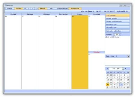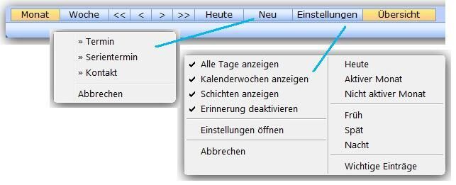 Die Übesicht beinhaltet diverse Buttons (z.Bsp. zum Erstellen neuer Termine, Serientermine, Kontakte usw.)