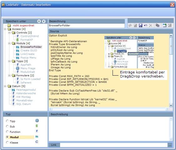 Funktionen, Prozeduren oder einzelne Codepassagen können direkt aus der VBE gespeichert werden. |