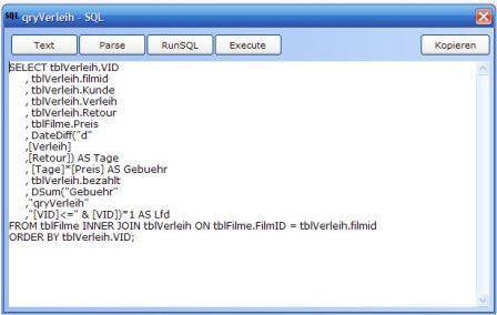 Der SQL Assi zeigt den Sql-Text der ausgwählten Abfrage an.